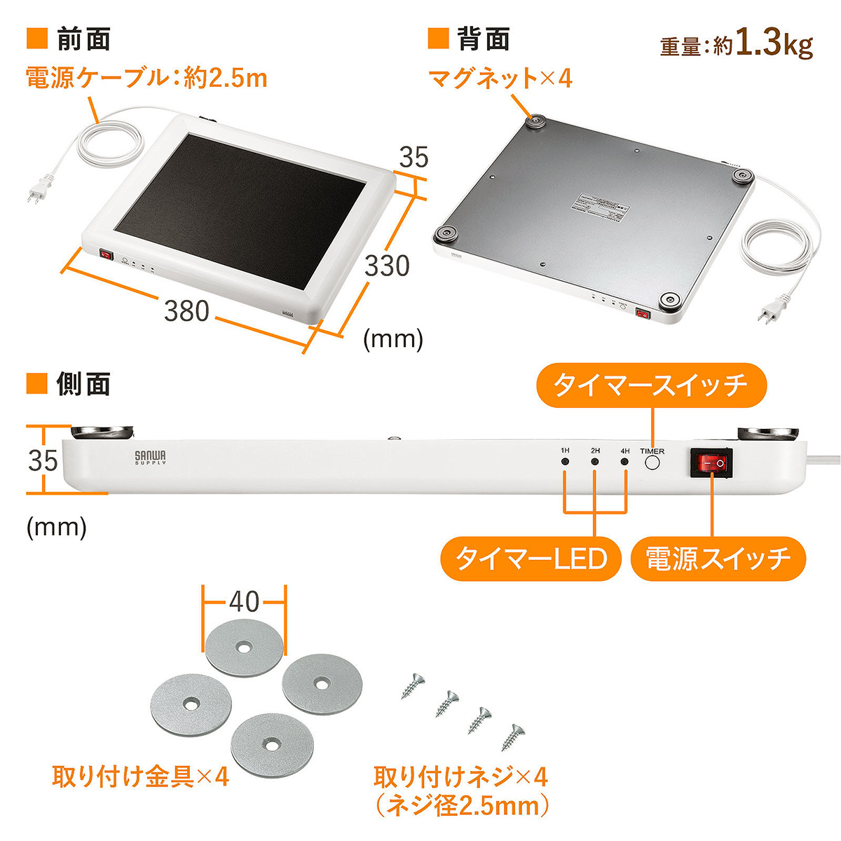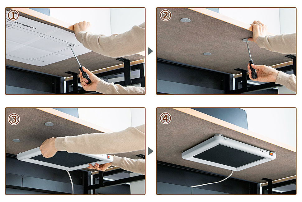 デスク下などにマグネットで装着して、足元を優しく温めるデスク用ヒーター![]() ■特長 ●本製品は耐熱ファイバー素材を使用した安全装置(自動OFF機能付き)付きのデスクパネルヒーターです。 ●自動OFFタイマー付きで、1時間から7時間までのタイマーOFFをボタン操作で設定できます。 例)タイマーを5時間で設定した場合は、1Hと4Hのランプが点灯します。 ![]() ●安全装置として、本体内部に温度ヒューズがあり、最大表面温度が55度以上になると、自動でOFFになります。 ●気付かずに、ONの状態で放っておいても、8時間後に自動でOFFになります。 ●底面には、強力マグネットが4隅に備え付けられており、デスク下の引き出しや、キャビネット側面などに装着することができます。 ●木天板などにも取り付けられるように、付属品として取り付け金具を追加しました。 ●薄型で、シンプルなデザインに仕上げておりますので、利用もしやすいサイズと形です。 ![]() ●新型コロナウイルス対策の換気による寒さ対策に 新型ロナウイルス感染症やインフルェンザ対策として、室内の換気はとても重要です。 しかし寒い日に換気をすると室温が下がり、寒くて作業効率が悪くなったり快適に過ごせなくなります。 ■木製の天板取付方法 付属の取り付け金具を使用することで、木製の天板でも本製品を取り付けできるようになります。 ①取付シートをデスクに貼付け、設置場所に穴などで印をつける。 ②天板に取付金具を設置 ③天板に取り付けた金具に、本製品のマグネット部分で取り付ける。 ④電源コードをコンセントにさして取付完了。 ![]() ■こんな場所にオススメ! ●職場のデスク・受付カウンター:足元が冷えてひざ掛けが手放せないオフィスや、受付カウンターなどに。 ●学習デスク:勉強を頑張るお子さまや、気温の下がる深夜・早朝に勉強する受験生に。 ●テレワークにも ![]() ■仕様