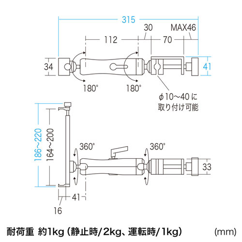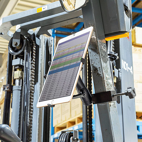 | フォークリフトなどの支柱にタブレットを設置できる支柱取り付け用タブレットホルダーです。 ※支柱に取り付けた際は、滑り落ちたり、クランプがずれたりしないことを確認したうえでご使用ください。