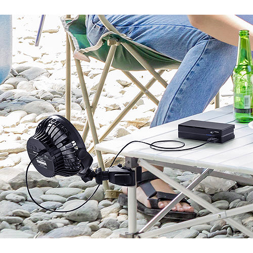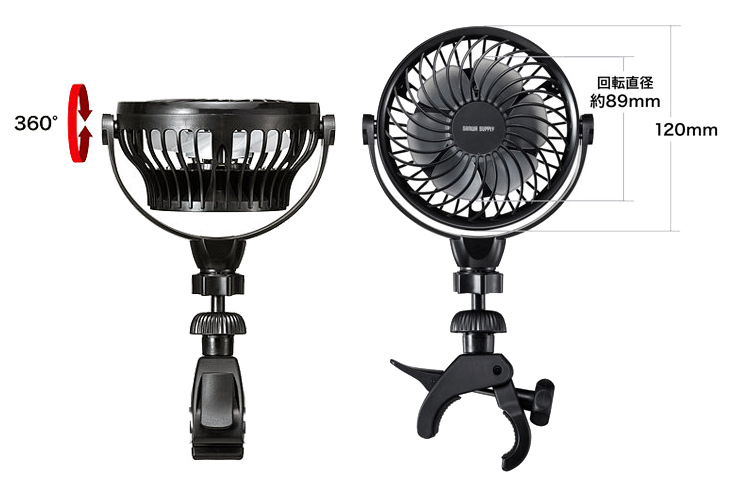 | 台車の持ち手やラックの支柱に固定できる、クランプ式の小型扇風機です。 繰り返し使用できるUSB充電式で、ケーブルなしで使えるのでどこにでも持って行って活用できます。 アウトドアや作業現場などの熱中症対策に。 ![]() ■特長 ●クランプでしっかり固定 カートの取っ手や支柱などにクランプで固定できる、小型の扇風機です。幅15~50mmの円柱・角柱に固定できます。 ●付属のUSBケーブルで充電できる USB充電ケーブルが付属しています。AC充電器や、USBポート付き電源タップなどに接続することで充電可能です。満充電で約2~7時間の使用が可能です。 ※風量の強弱によって使用可能時間が異なります。 ●リチウムイオン電池を内蔵し、充電して繰り返し使用できます。 ●用途や場所、好みに合わせて4段階の風量調節ができます。 ●充電状況がわかるLED付きです。 ●ボールジョイントで、上下左右 自在に回転 ボールジョイントが内蔵しており、上下左右どの向きにもフレキシブルに動かすことができます。柱に固定したまま風向きを調整できるので便利です。 ●角度調整も可能 ファンの角度も調整できます。柱に固定したまま、上下お好きな角度に向けることができます。 ![]() ■使用例 ![]() ■仕様