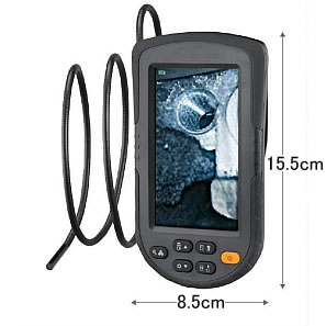 | 370g、15cm。 手のひら大画面。 手の届かない場所を確認・撮影・保存。 4.3インチ大画面カラーディスプレイ搭載、手のひらサイズの携帯工業要内視鏡 視野角65°、解像度1280×720ピクセルの高解像カメラで手の届かない場所をスマートフォン感覚で確認・撮影・保存。 静止画・動画撮影もワンボタン。 10段階輝度調整、4倍デジタルズーム。 ![]() ■特長 ●直径5.2mm、長さ1m、6LED内蔵防水型カメラケーブル ●4.3インチTFT大型ディスプレイ ●カメラ解像度1280×720ピクセル ●視野角65° ●静止画・動画撮影、MicroSDカード保存(最大32GB) ●マグネット・ミラー・フック。カメラ先端取付用アタッチメント付属。 ![]() ![]() ■直径5.2mm、長さ1m、6LED内蔵防水型カメラケーブル ![]() ■MicroSDカード保存、Micro-USBポートでPCへの保存も容易 ![]() ■本体にカメラケーブルを巻き付け、コンパクト収納 ![]() ■天地・左右が把握しやすい画像回転機能 ![]() ![]() ■寸法図 ![]() ■仕様