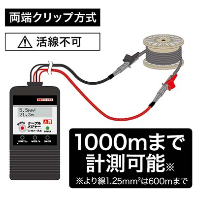 シングルケーブル(IV,CV)の長さを計測できる!![]() ■特長 ●簡単操作! 電線の両端に接続して、ボタンを押すだけ ●600V ビニル絶縁電線(IV)等の長さを素早く計測できる ●1000mまで計測可能※1 ●両端クリップ方式 ●活線不可 ●ユーザーモードでサイズのわからない電線も測定可能※2 ※1 より線1.25m㎡は600mまで ※2 同仕様の長さのわかっている「基準電線」が必要 ![]() ■用途 ●ケーブル残量の測定 ●ケーブル交換時の測定(引き出した古いケーブルの長さ測定等) ■仕様 ●適合電線:600Vビニル絶縁電線(IV電線)、電力ケーブル(600V CV) ●適合サイズ ・単線:1.6,2.0,2.6mm ・より線:1.25,2,3.5,5.5,8,14,22,38,60,100,150,200,325m㎡ ※片端の出ていないドラム巻きは計測不可 ●電線サイズによる測定可能長さ 〇単線 ・導体サイズ:1.6m㎡ 測定可能長さ:1~1000m ・導体サイズ:2.0m㎡ 測定可能長さ:1~1000m ・導体サイズ:2.6m㎡ 測定可能長さ:2~1000m 〇より線 ・導体サイズ:1.25m㎡ 測定可能長さ:1~600m ・導体サイズ:2m㎡ 測定可能長さ:1~1000m ・導体サイズ:3.5m㎡ 測定可能長さ:1~1000m ・導体サイズ:5.5m㎡ 測定可能長さ:2~1000m ・導体サイズ:8m㎡ 測定可能長さ:2~1000m ・導体サイズ:14m㎡ 測定可能長さ:5~1000m ・導体サイズ:22m㎡ 測定可能長さ:5~1000m ・導体サイズ:38m㎡ 測定可能長さ:10~1000m ・導体サイズ:60m㎡ 測定可能長さ:15~1000m ・導体サイズ:100m㎡ 測定可能長さ:25~1000m ・導体サイズ:150m㎡ 測定可能長さ:35~1000m ・導体サイズ:200m㎡ 測定可能長さ:45~1000m ・導体サイズ:325m㎡ 測定可能長さ:75~1000m