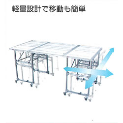 | スピーディな組立・収納により、作業の迅速化を実現 作業ポイント約2.5~3mの高さで使用できます。 ![]() ●スピーディな組立、収納 ●一人でも容易な高さ調整 ●オプションが充実 ●軽量設計で移動も簡単 ■連結して敷き詰めることで作業効率がアップします。 ※オプションの連結ブリッジ4枚装着例 ※写真撮影のために補助手すりを外しています。 ![]() ■収納状態 ![]() ■伸縮性 ![]() ■移動可能 ![]() ■寸法図 ![]() ■スペック表