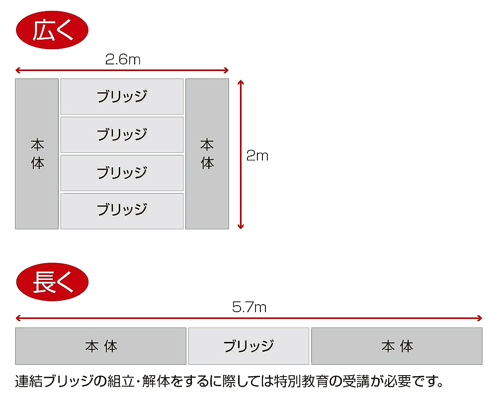■オプション使用例 ●連結ブリッジ(M154SK-100AN)を併用することで、作業スペースを長く、広く設置でき、足元の安全性が向上し安定した作業が行なえます。 ![]() 画像使用例:作業台(M154SK-1970HN)×2台、可搬式高所作業台用ガード手すり(M154SK-921*N)×2本、連結ブリッジ(M154SK-100AN)、補助手すり(M154E-900N) ![]() ●作業ポイントが4mの高さでご使用できます。 アウトリガーを設置することで、店頭の抑制を行う事ができます。 ![]() 画像使用例:作業台(M154SK-1970HN)、可搬式高所作業台用ガード手すり(M154SK-921*N)、アウトリガー(M154SK-31EN)×2本