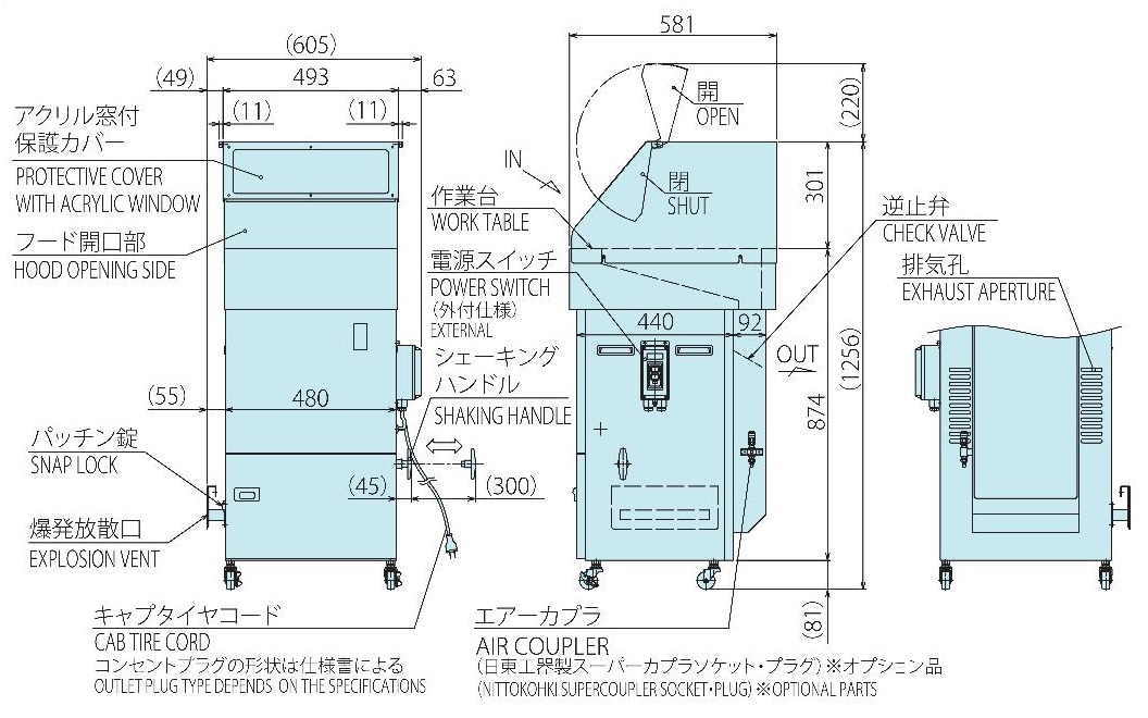※「簡易防爆+火花対策」仕様は制作不可能です。 ※1:国内向け100V Aプラグ仕様、海外向け220V Cプラグ付仕様 ※2:測定位置:正面1m・高さ1m ※3:アクリル窓の開口高さは( )内の寸法となります。 |