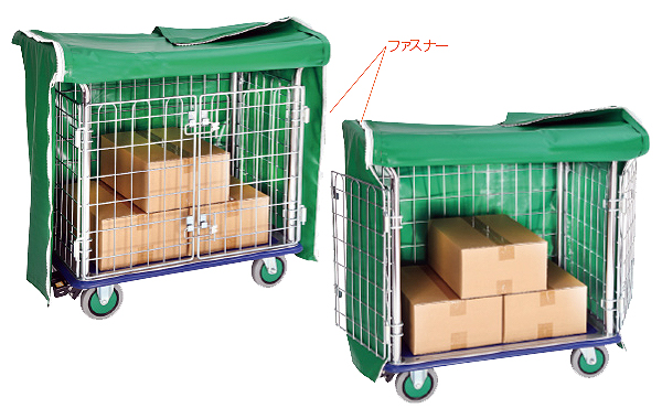 ■オプション ●シートカバー ●防水・防塵・防犯に効果的で、着脱容易なシートカバーです。 ●両サイドはファスナー付きで開閉が簡単にできます。 ●ファスナーはシートの上面から60mm下が開閉できます。(降雨の状況により、ファスナー 部分から雨水が染み込む場合もあります。) ●シートカバーは、若干余裕を持たせて作ってありますので、カバーを被せた状態でも、カバーの上からハンドルが握れるので、そのまま台車の走行が可能です。 ![]() ![]()