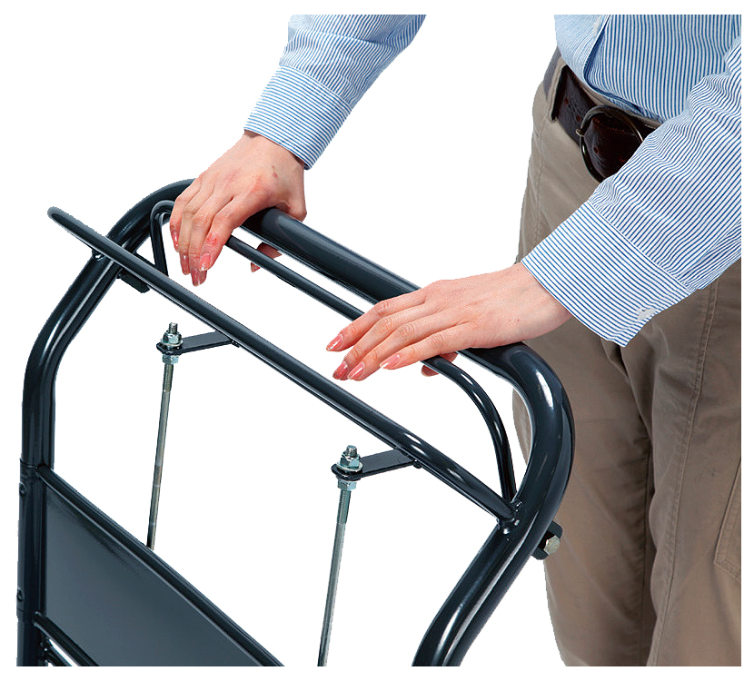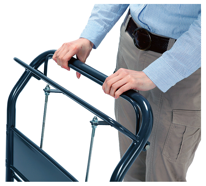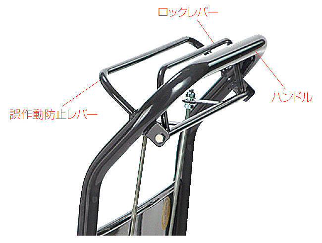 | ■特長 ●ハンドブレーキ付き台車の空気入りタイヤ付きタイプ。クッション性のある静かな走行感が特長です。 ●タイル・カーペット床にも最適です。 ●ピン式ロックシステムにより、ハンドル(ロックレバー)から手をはなすと自動的に固定車2輪の回転がロックされて完全停止します。 ●ピン式ロックは耐久性が高く、かけ忘れ事故のない安心・安全のロックシステムです。 ●ロックレバーは軽く作動するため、手が疲れません。 ●金網付きタイプは、左右に側面まで大きく開きますので、荷物の積み降ろし作業が楽にできます。(下画像はM198K107K-HB) ![]() ■使用方法 ●走行時 ロックレバーを握るとロックは解除されて走行可能となります。ロックレバーは軽いタッチで作動します。 ![]() ●停止持 ロックレバーを離すと自動的に固定車2輪の回転がロックされて完全停止します。 ![]() <注意> 走行中はロックレバーから手を離さないで下さい。台車が急停止して事故や故障の原因になります。必ず台車をとめてから手を離して下さい。 ![]() ■仕様