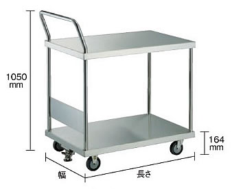 | 溶接構造のSUS製の2段式台車です。 本体およびキャスター金具までSUS304製ですので、食品工場やクリーンルームに使用できます。 ハンドル高さが1050mmと高く背の高い方も楽に使用できます。 ![]() ■用途 食品工場、研究所など ■仕様 ●完成品 ●自在キャスター、固定キャスター各2個 ●材質 ステンレス(SUS304) 車輪:ナイロンウレタン ●製造国 日本 ■寸法図 ![]() ■仕様
