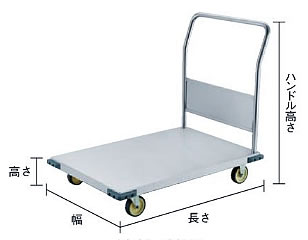 | ●荷台にしっかりと補強の入った、板厚1.5tの頑強な溶接式のSUS304製台車です。 ●キャスターもSUS金具ですので、食品工場やクリーンルームで使用できます。 ![]() ■用途 食品工場、研究所など。 ■仕様 ●完成品 ●自在キャスター、固定キャスター各2個 ●固定ハンドルタイプ ●材質 ステンレス(SUS304) 車輪:ナイロンウレタン ●製造国 日本 ■寸法図 ![]() ■タイプ