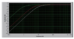 図 2 は、1Hz(緑)、5Hz(赤)と 10Hz(白)カットオフでの応答であり、3.2 kHzのサンプリング周波数で調整したHPFの低周波応答特性を示しています。