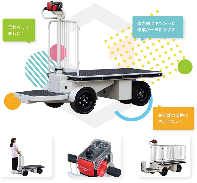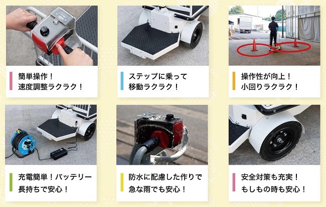 ●乗れる電動台車 ●作業が圧倒的に楽になる ●女性やシニアの方も簡単に使える ●前進、後退、操作もラクラク ●メーカー従来品より小回りが効くように改良 ![]() ![]() ■用途 荷物の運搬・ピッキング作業など ■特長 ![]() <簡単操作!速度調整ラクラク!> 本製品の操作はハンドル部分に集約されています。 スロットルを回すだけで前進・後退でき、つまみで速度を無段階調整できます。 <ステップに乗って移動ラクラク!> 本製品はステップに乗って運搬できるので長距離移動もラクに行なえます。 視界も高く良好な為、安全に運搬できます。 <操作性が向上!小回りラクラク!> 本製品は前輪を中央に寄せることでメーカー旧型の製品よりも小回りが効くよう改良しました。 限られたスペースでも、より快適に運搬できます。 <充電簡単!バッテリー長持ちで安心!> 本製品は家庭用電源プラグ(8~10時間の充電)で最大6時間稼働します。 残量はバッテリーインジケーターで一目で確認できます。 <防水に配慮した作りで急な雨でも安心!> 本製品はハンドル部分には雨よけカバーが付いており、屋外でも安心して作業できます。 ※完全防水ではございません。 ※ホースや高圧洗浄機等で直接水をかける行為はお控えください。 <安全対策も充実!もしもの時も安心!> ハンドル部分に緊急停止ボタン、スロットルにはブレーキ機能を搭載しています。 更に、後輪にはタイヤカバーがあるので事故防止に繋がります。 ■仕様