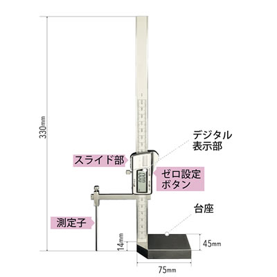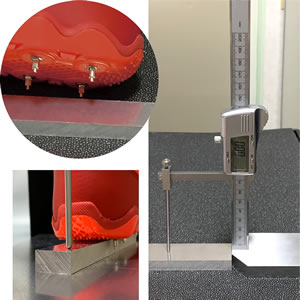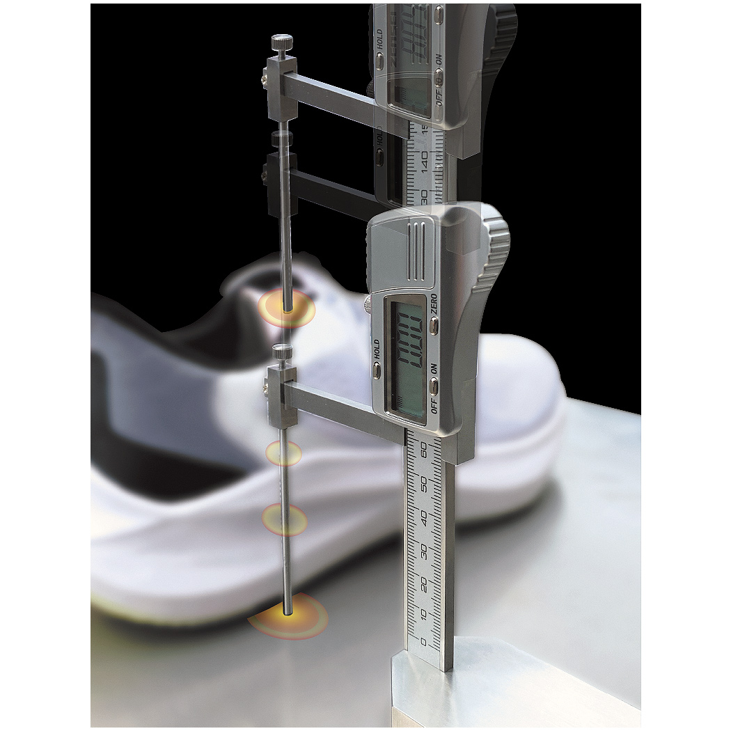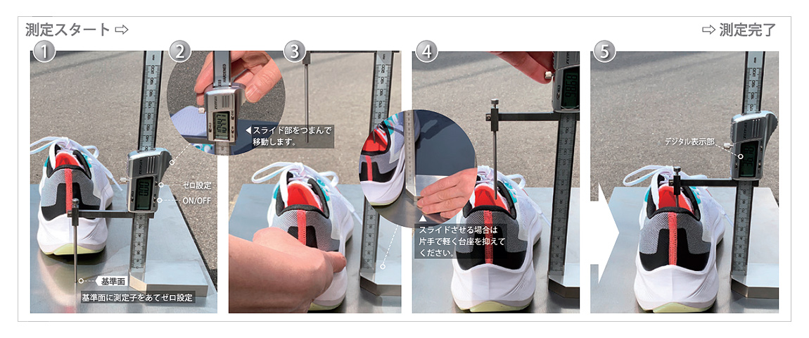 | 陸上競技用シューズ(ランニングシューズなど)の靴底厚さを測定する測定器です。 シューズのかかと中央部に直接測定子をあて測ることができます。 測定器とセットでお使いいただける測定台や基準バーもご用意しています。 ソールの厚さを正確に簡単に秒速測定 ![]() ■特長 ●かかと中央部をピンポイントで測定 シューズの中に直接測定子を入れることができるため、かかと中央を簡単にとらえることができます。 シューズメーカー提供の「ソールの厚さ」だけではインソールを含めた厚さや底のすり減りなど、正しい測定ができません。 競技直前に測定することで実際の使用時の靴底の厚さを簡単に測ることができます。 ※0.01mm単位で測定ができ、使用後の靴底すり減りの状態も管理可能です。 ![]() ●安定感抜群の測定台 グランドの地面や安定しないベンチの上でも測定台を使うことで正しく測定器を設置することができます。 ![]() ●ハイカットシューズも測定可能 測定子をハイカット用に交換することで測定できます。測定子の付け替えはネジ式で簡単に誰でも行えます。 注)測定子のネジ部分にはゆるみ止めのナットが入ります。取り替え時にナットの付け忘れにご注意ください。 ![]() ●スパイク使用のシューズもそのまま測定 基準バー(M2611G-PL13Z)を敷き込むことでスパイクを外さずに測定することができます。 ![]() ■使い方 正確に測定するために測定台または平らな場所に設置して測定を行ってください。 1.電源を入れる –測定器の「ON/OFFボタン」を押し電源を入れます。 2.基準面を決める –測定器をテーブルなどの平らな台の上に設置して測定子を基準面にあてて「ゼロ設定」ボタンを押します。 (ゼロ設定後は連続で測定できますが定期的にゼロ値が正しいかご確認ください。) 3.シューズを設置する –スライド部をつまんで上に移動させます。 シューズのかかと中央部が測定子の下にくるようにセットします。 4.厚みを測定する –スライド部を下げ 軽くシューズの靴底に測定子をあてます。 5.数値を確認する –デジタル表示部で厚みの数値を確認します。 ![]() ■寸法図 ※支柱に印字されているメモリはデジタル測定器の機能が正常かどうかを確認するものです。 ![]() ■仕様