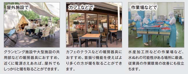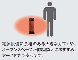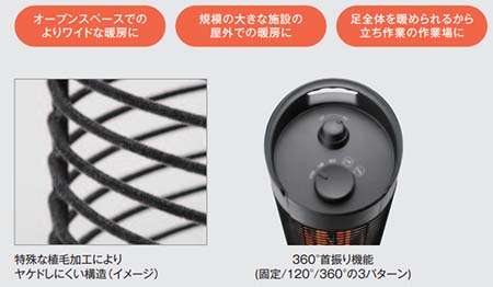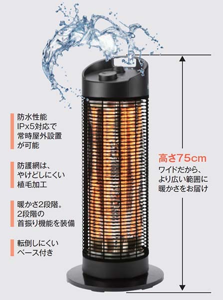 | 屋外でも腰あたりまで暖かい 電源設備に余裕のある大きなカフェや、 オープンスペース、作業場などにおすすめ。 アース付きで安心です。 ![]() ■概要 屋外でも、腰あたりまでワイドに暖かい。 高さ75cmのトールタイプのラウンドヒーターで、従来の2モデルよりも、高さがあることで、より広い範囲に暖かさをお届けします。 イスに座った状態で、足元や膝はもちろん、腰あたりまで、やわらかな暖かみを感じることができます。 ●1400Wの大型トールタイプですが、100V電源で使用可能です。 ●防水仕様「IPx5」対応で、屋外で安心してご使用いただけます。 ●底面には、転倒リスクを抑えるベースを装備しています。 ![]() ![]() ![]() ![]() ![]() ■シリーズの機能はそのままに! 暖かさをよりワイドにお届け!! ![]() ■特長 ●安心の防水性能IPx5に対応 防水性能IPx5に対応した製品で屋外に常時設置することも可能です。 屋外で あれば、デッキやテラスなどに。 屋内であれば作業場やご家庭の洗面室など、 幅広くご活用いただけます。 ●細やかな気配りが可能 季節や利用者との距離などにあわせて、パワーを100%と50%の2段階で切り替え可能です。 また首振り機能を搭載し、固定/120°/360°の切り替えが可能で、利用者に快適な暖房空間を提供 します。 ●安全に配慮した製品 接触や地震など、本体が転倒すると自動的にオフになります。 また、ヒーターに触れることを防ぐ防護網には、特殊な植毛加工を施すことでヤケドしにくい構造になっています。 ■ビジネスからご家庭まで、さまざまな現場でご活用いただけます ![]() ■仕様