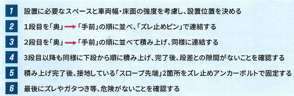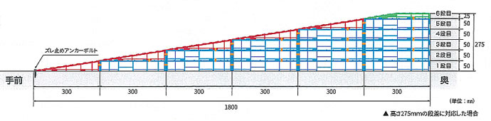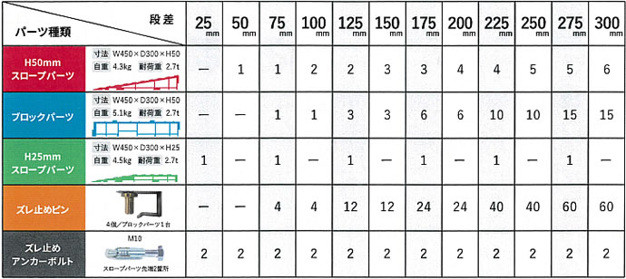 | 組み合わせて様々な高さの段差を解消 高さ調整25mmピッチ 対応高さ25mm~ 組み合わせ次第で多様なシーンでご活用頂けます。 耐荷重:2.7t ![]() ■抜群の強度 並列2列で総重量5.4tの車両まで対応可能。 フォークリフト、高所作業、2tトラックなど現場のニーズに応えます。 ※左右均等に荷重を掛けて使用した場合 ![]() ![]() ■超軽量 1パーツあたり5kgの軽量型。 手運びで安全に設置ができます。 また、移設変更も簡単にできます。 ■連結部 ![]() ■使用イメージ ![]() ■パーツの組み合わせによって段差調整が可能 ![]() ■1列あたりの構成パーツ ![]() ※2列で使う場合は、2倍の数量になります。 ![]() ![]() ■設置手順 ![]() ![]() |