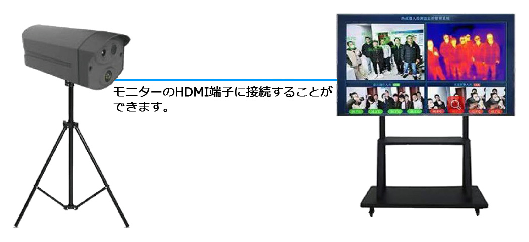| 高精度体温測定と監視カメラを複合させ、AIによって複数の人数の体温を最大3m(推奨は1m~2.5m)まで非接触かつ高速に検知します。 病院、学校、ターミナルのような公共のエリア、火災の防止が必要な倉庫や建物内などの用途に使用できます。 アラーム機能を利用すれば検知場所に常時はりついていなくても、体温が規定値を越えた際に警告音で知らせてくれます。 監視カメラとAIで顔認識し、サーマルモジュールでその体温測定します。 モニターのHDMI端子に接続することができPCが不要になります。PCとの1対1接続でのスタンドアローンも可能ですし、LAN接続で体温測定することも可能です。 PC接続の際は、日本語での設定メニューで温度設定やアラームを容易に行えます。 ![]() ■特長 ●HDMI 出力を直接モニターに接続でき、PC が不要になります(英語表示)。 ![]() ●従来機種同様に PC と接続し体温検出と温度設定変更などができます。 ●LAN に接続すれば複数の PC、ユーザが見ることができます。 ●同時に20人から30人までの顔検知ができる AI を備えています ■仕様