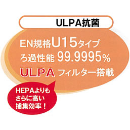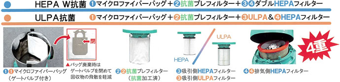 | HEPA/ULPAフィルター搭載 吸塵専用 真空掃除機 抗菌加工。主な樹脂部分に銀系抗菌含有の樹脂を使用。 バキュームヘッドやタンク内外の細菌の増殖を抑制します。 ![]() ![]() ![]() ■HEPA抗菌 ●吸引側にHEPAフィルター、排気側には高性能フィルターを標準装備 ●軽量・小型・コンパクト。パワフルなのに54dB(A)と静音設計 ●ゲートバルブ付きマイクロファイバーバッグで廃棄時の飛散を軽減 ●粉体回収に適した静電気対策設計 ■HEPA W抗菌/ ULPA抗菌 ●吸引側に抗菌加工を施したプレフィルターを採用 フィルタ-への粉塵付着による吸引力の低下を抑えます。 ●吸引側にHEPAフィルターまたはULPAフィルターを標準装備 ●さらに排気側にもHEPAフィルターを標準装備 ●ゲートバルブ付きマイクロファイバーバッグで廃棄時の飛散を軽減 ●耐腐食性、耐薬品性に優れたSUSタンクを採用 ●粉体回収に適した静電気対策設計。 ![]() ■特徴 ![]() ![]() ■目詰まり表示灯 マイクロファイバーバッグやフィルターが目詰まりした時に点灯します。 ![]() ■抗菌樹脂加工 銀系抗菌を添加した樹脂を採用することで、表面に付着した細菌の増殖を抑制します。 ![]() ![]() ■タイプ
