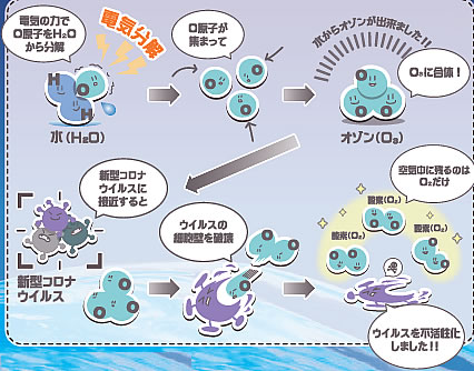 | オゾンミストは健康への安全性に優れています。 5mg/L以上のオゾン水で新型コロナウイルスを不活性化 高濃度オゾン水の必要性 オゾン水濃度5mg/L以上であればウイルスは検出限界以下まで減少させることが確認されました。 ウイルス不活性化&消臭&加湿 ![]() ■新型コロナウイルス・A型インフルエンザウイルス M3410NZ-21Mで生成したオゾン水を滴下したところ新型コロナウイルスに対するオゾン水との接触わずか10分で感染価が検出限界以下(ウイルス不活性化率99%以上)となり、高い効果が確認されました。 A型インフルエンザウイルス・ブタコロナウイルス・大腸菌などの試験でも90%以上不活性化するという効果が確認されました。 ![]() ■オゾンによる新型コロナウイルス 不活性化の仕組み ![]() ■オゾン水の安全性 オゾン水はオゾンガスとは異なりかなりの高濃度(10mg/L程度)でも安全です。 オゾンガスが水中に完全に溶け込んでいることにより、空気中への放出は殆んどなく、人体への影響はありません。 ![]() ■実用例 身体への影響を心配する必要が無いので、人の密集する場所、長時間使用する空間などで威力を発揮します。 薬剤や次亜塩素酸水のように残留物質が周囲に付着することもないので拭き取りなども不要です。 エントランスホール、スポーツジム、教習所、受付、飲食店 ![]() ■オゾンのニオイがしない 通常オゾンには強烈な刺激臭がありますが、M3410NZ-21Mはオゾンミストにオゾンがしっかり溶け込んでいるためオゾン特有の臭いはほぼしません。 そのため様々な生活空間での活用が期待できます。 ■身体にやさしい 人や動物の皮膚の主成分であるタンパク質と反応して酸素に変わるので、オゾン成分が細胞内まで届かず、美肌効果があるとも言われています。 最近までは美容専門のオゾン発生器も増えてきました。 ■耐性菌が出来ない 塩素などの薬剤等は、その薬剤に対して耐性菌ができ、より強力な細菌等を作り上げてしまいます。 オゾンは細菌やウイルスの細胞壁を分解して穴を開けてしまうので細胞等が死滅もしくはウイルスが不活性化となり、耐性菌ができます。 ■スイッチ一つで作動する簡単操作 ![]() ■仕様
