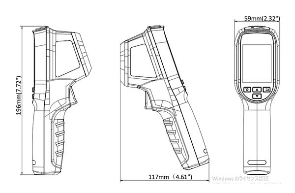 M3427E-1LTはサーマルテクノロジーに基づき、温度測定のニーズに応じて作られているため、現場で迅速にトラブルを排除することが可能![]() ■概要 ●熱画像解像度: 160 × 120 (19 200 画素) ●NETD : < 40mK (@ 25℃,F#=1.0) ●温度測定範囲 : -20℃ - 550℃ ●精度: 環境温度が15℃ to 35℃、目標物温度が0℃以上である場合、精度が最大 (±2℃/, ±2%) ●温度測定ルール: センタースポット、ホットスポット、コールドスポット、オフ ●フレームレート:25 Hz ●質量: 350g (0.77 lb) ●バッテリー駆動時間:8時間 ■寸法図 ![]() ■仕様