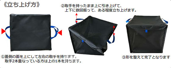 | キャンプ場内でご採用!安心の防炎仕様。簡単コンパクト折りたたみ式 カラス対策用のごみ箱や、レジャー時の多い荷物を一つにまとめたり用途は自由! 設置、撤去が簡単 ![]() ●防炎仕様のため屋外での使用も安心 ●中身が見えにくくプライバシーに配慮。目の細かい黒色メッシュ仕様 ●カラス対策にも最適蓋付き仕様 ●折りたたみが出来て便利な取手付き。不要時はフックに吊り下げ可能 ●水洗いも出来て衛生的 ●信頼の国内生産、職人による1個ずつ丁寧な手作り製品 ![]() ![]() ■本体ポリ塩化ビニル(消防庁防炎規格適合品) ![]() ■各部説明 ![]() ①天板の蓋は、前面と両側面にマジックテープ付きでしっかり固定 ②取手付きで持ち運びに便利。折りたたんでも取手が使えます。 ③背面部左右にハトメ付き。紐等を通してしっかり固定 ![]() ![]() ※生地の特性上、完全に立ち上げ、折りたたみが出来ません。 ある程度の状態で折り目をしっかり伸ばして形を整えて下さい。 ■仕様