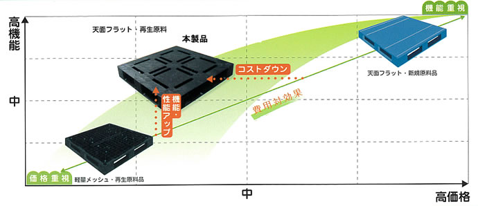 | 製造販売するリサイクルパレットは、再生プラスチックを原料とするパレットです。 原料にプラスチック製容器包装などからの再生リサイクル原料を用いており、プラスチック資源のマテリアルリサイクル、CO2削減に貢献しております。 ![]() ■強みはコストパフォーマンス ![]() ■跡付き改善 ![]() ■使用例 ![]() ■JIS規格相当の強度を確保 いかに環境に優しい原料を使用していても、きょうどに不足のあるパレットでは使用できません。 メーカーは独自の配合及びパレット設計により、プラスチック再生原料を使用しながら、JIS規格相当の強度を保っております。 また万全の品質管理を行っており、社内基準を満たさない製品は一切出荷しておりません。 ![]() ■パレットのカラー範囲 本製品は容器包装リサイクル材および再生プラスチック材を使用使用した混合品ですので製品色調には多少のバラつきがあります。 レギュラー色の色調はグレー~黒 ■リサイクル原料に関して ・お客様によっては臭気を感じる場合がございますが時間経過と共に減少する傾向があります。 気になる場合は事前にサンプルにてご確認ください。 ・当製品はリサイクルを使用しているため、主原料以外の樹脂が含まれることがございますが強度に影響はございません。 ■タイプ