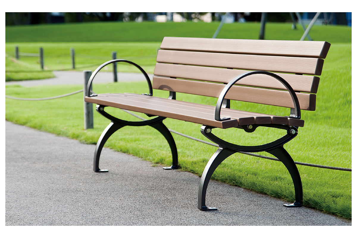 屋外ベンチ(再生木材EMウッド)背もたれ・ひじ置き付き 品番 M3472EG-1800A-EM 価格は下記をご覧ください |