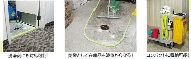 | 液体がドライエリアや隙間に流れ出すのを防ぎます。 目立ちやすいイエローグリーン ●耐久性があり、洗って何度でも繰り返し繰返ししようできます。 ●底部は床面にしっかりと密着し、液体をブロック。 ●必要な長さにハサミで簡単にカットできます。 ![]() ■清掃時の ![]() ![]() ![]() ■仕様