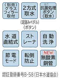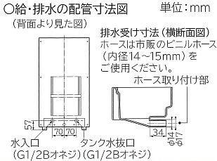 | 水道直結冷水ウォータークーラー 屋外に据え付けないで下さい。 また、水のかかる場所や湿気の多い場所には据付ないで下さい。 絶縁が悪くなり、漏電し感電や火災の原因になることがあります。 ![]() ■スポーツクラブや待合室などで活躍。 ■グラスフィラーが取付可能 別売のグラスフィラーを取り付けることで、コップや水筒に飲料水を注ぐことができます。 ![]() ■足踏みペダル、ボタンの両方でみずが出せる。 ![]() ■ボタンを抗菌化 ※1・試験機関:一般財団法人日本食品分析センター ●試験方法:フィルム密着法(JIS Z 2801) ●抗菌の方法:銀系抗菌剤を添加 ●試験の結果:24時間後に90%の抗菌効果 ![]() ■水道直結式で給水の手間なし ■80メッシュのストレーナを同梱 配管接続時に取り付けることで、水道配管内のさび等を除去し異物による電磁弁等の故障を防ぎます。 また、ストレーナは製品の外に取り付けるので、簡単に掃除が出来ます。 ![]() ■タンク内を1日1回、自動洗浄 タンク内の水を1日1回自動排水し、新しい水と入れ換えます。 タイマー式なので洗浄時刻を設定できます。 ※自動洗浄は約7分かかります。洗浄中はランプが点灯します。 ■水温の設定を変更して節電 通常約6℃のタンク内の冷水設定温度を約8℃に上げて、消費電力量を抑えます。 室温30℃の場合、最大で約12%の節電効果 ※2があります。 ※2 室温30℃、水温25℃での消費電力量の比較。 通常運転モード時:179Wh、節電モード時:156Wh。 ご使用の状況により効果は異なります。 JIS C 9618の測定方法に準じていますが、冷水温度等の条件は異なります。 節電モードでは冷えが弱いと感じられることがあります。 ■L字形固定金具付き 転倒防止のため、床面に固定するL字形本体固定金具を付属しています。 ![]() ■冷却器に無酸素銅管を採用 蟻の巣状腐食に強い無酸素銅管を冷却器に採用しました。 ■床置型/冷水専用 ●水道直結冷水ウォータークーラー/M391W-227PDH 冷水供給能力アップ 冷凍サイクルの効率化により、1時間あたりの冷水供給能力が約10%アップしました。※1 ![]() ![]() ![]() ![]() ![]() ![]() ■床置型/冷水専用 ●水道直結冷水ウォータークーラー/M391W-226PH 冷水供給能力アップ 冷凍サイクルの効率化により、1時間あたりの冷水供給能力が約10%アップしました。※1 ![]() ![]() ○配管接続例※3 ![]() ![]() ![]() ■卓上型/冷水専用 ●水道直結冷水ウォータークーラー/M391W-146PH ※飲料水出口から飲料水が垂れることがあります。 これは水を冷やすためにタンク内に氷が生成された場合や、飲料水取り出し直後の配管部に入っている水が垂れることで起こる現象です。故障ではありません。 ![]() ![]() ![]() ![]() ○配管接続例※3 ![]() ※3: 図は配管の一例です。 各配管に記載した配管径は硬質塩化ビニルライニング鋼管を使用する場合の配管径です。 配管の詰まりを防止するため付属の外付けストレーナをキャップが下になるように配管して下さい。 配管に必要なバルブ類や管材は付属していません。 水入口バルブは水量調整に適するグローブバルブ型を使用して下さい。 ■別売部品 ●ノズルからコップなどに飲料水を注ぐときに ![]() ●ホコリが発生しやすい場所で使用されるときに ※銭湯・スポーツジム・学校渡欧埃が発生しやすい場所では製品購入時よりご使用ください。 ※適用機種:M391W-227PDH/M391W-226PH ![]() ■タイプ