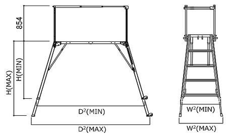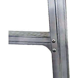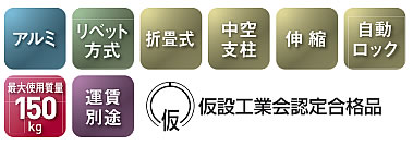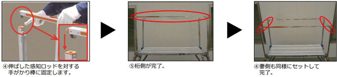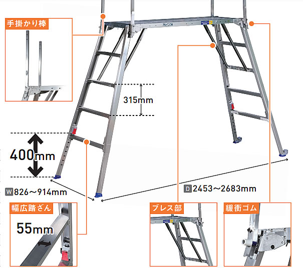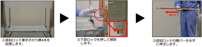 | 安全性と耐久性を徹底追求した可搬式作業台 ブレス材を2段目の踏ざんに装着し、安全性の向上を実現。 手掛かり棒を床材に対して垂直に設置することで、有効作業面積が拡大しました。 55mmの幅広踏ざんを採用しています。 ![]() ![]() ●四辺を囲む感知ロッド 感知ロッドを手がかり棒に装備することにより、設置・収納が簡単 昇降時には妻側感知ロッド をワンタッチで開閉可能 ※感知ロッドに乗ったり、寄りかかったりしないで下さい ![]() ●垂直に設置する手がかり棒 手がかり棒を床材に対し垂直に設置することにより、有効作業面積が拡大 ![]() ●55mmの大型ステップ 55mm幅の大型ステップを採用し、安定性が向上(CSR比:約38%アップ) ![]() ●高さ調整は50mmピッチ×8段調整 ![]() ●優れた安定性 ブレス材を2段目の踏みさんに装着し、安定性の向上を実現 ![]() ●堅牢設計ブラインドリベット接合部は高強度リベットを採用し締結力を向上 ![]() ![]() ■感知ロッド組立手順 ![]() ![]() ■タイプ