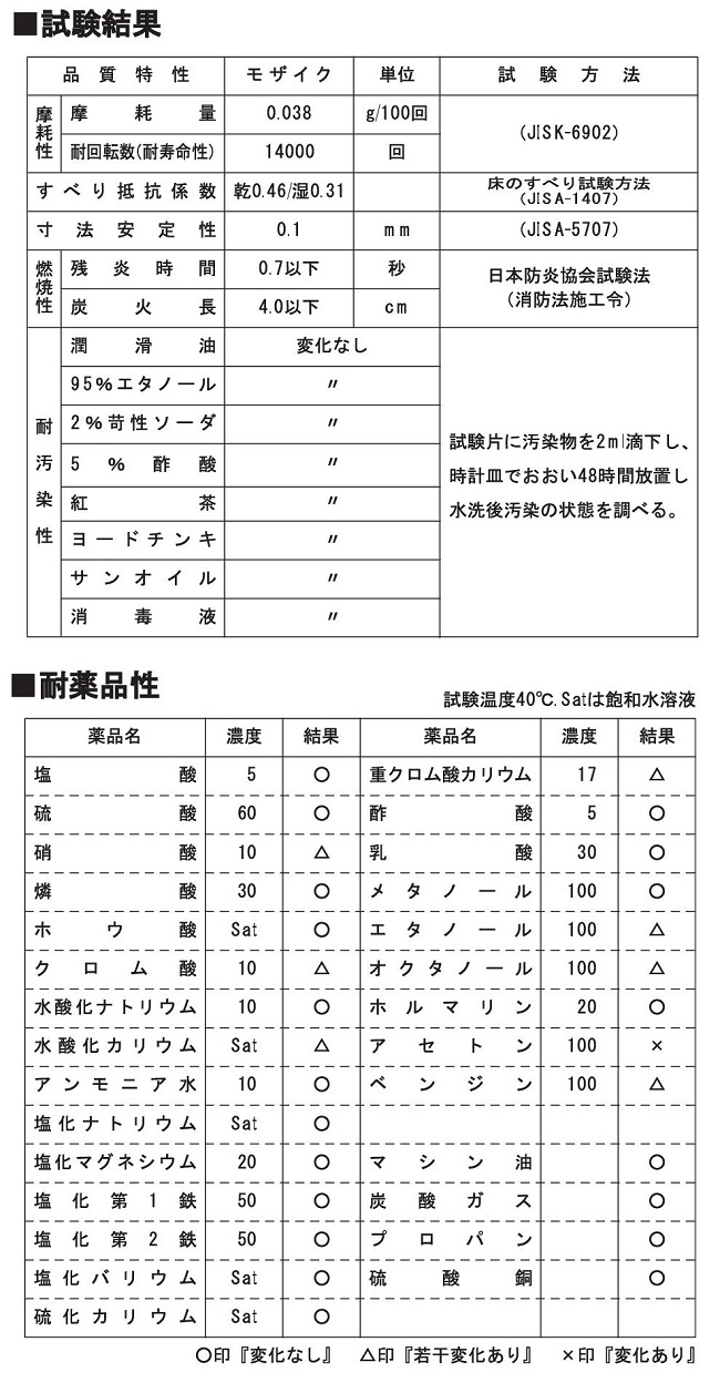 ![]() ※この試験は、3ヶ月間試料を薬品に浸漬させた最も過酷な条件下に於ける結果で、一般的には液をこぼした場合の様に、比較的短時間の耐薬品性問題となることが多く、『若干変化あり』と判定したのも、直ちに洗浄すれば使用上何ら差しつかえないと判断する。 |