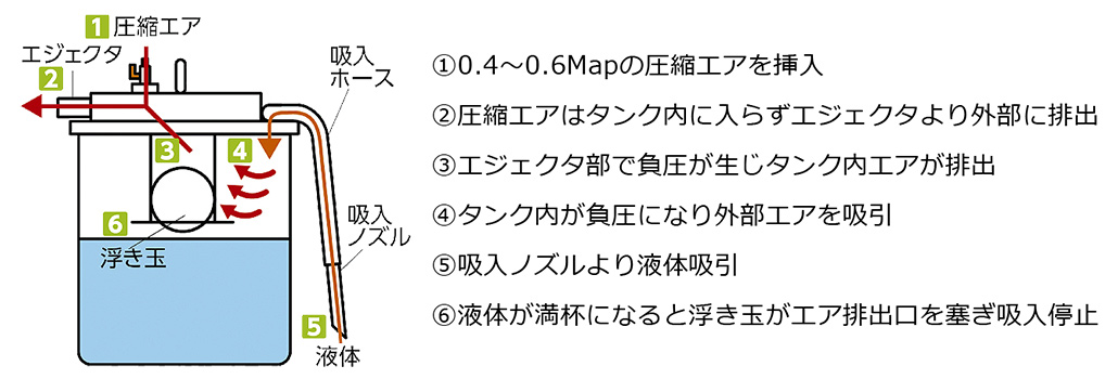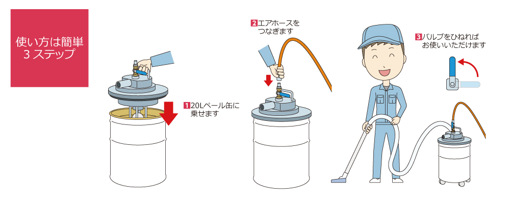 ■特長 ●シンプル構造で故障知らず エア駆動のため連続して使用でき、可動部無しでお手入れカンタン、丸洗いも可能液体と切粉やスラッジなど一緒に回収できます。 ![]() ●エア駆動なので防爆地域でも安心 電気を使用しない為、現場でオイルはもちろん、火気厳禁エリアでも漏電せず安心です。 5馬力(3.75kw)以上のエアコンプレッサで使用可能 ●新機能搭載でより便利に、カンタン操作可能 サイレンサー、スイベル継手、ノズル収納が新機能として標準装備でより便利に使用できます。 ●市販のペール缶に乗せるだけで使用可能 エアホースにつないで、オープンペール缶に乗せて使用します。缶を替えれば分別回収も可能です。 JIS規格20Lオープンペール缶(天部外径300mm±1用、板厚0.4mm以上推奨) ●全方向排気構造で、スムーズな排気を実現も可能にしたサイレンサー ![]() ●スイベル継手が付属し、ホースの取り回しが楽に ![]() ●ホースノズル簡単収納 ![]() ■使い方は簡単 3ステップの準備ですぐにお掃除可能です ![]() ■用途 自動車整備工場での機材周辺や車両清掃 パルプ工場・製紙工場・印刷工場の清掃 ゴム製造工場などでの切断片の回収 金属加工の切削・切削油の回収 造船所や船底ビルジの清掃 倉庫・通路の清掃 浄化槽やピットのヘドロ・汚水回収 溶接スパッタの回収 グリストラップや浮上油回収 ■付属ノズル(フルセットの場合)