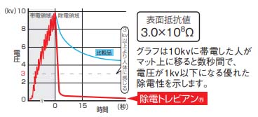 静電防止糸や導電性裏材を併用し、人体の静電気を除くマットです。![]() ■特長 ●表面抵抗値:3.0×108Ω ●制電 ![]() ■除電特性(人体電位減衰)曲線 ![]() ■仕様 ●材質 表面:ナイロン100%(B.C.F.ナイロン、他)、裏面:特殊塩化ビニール