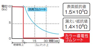 | 導電用 目に優しく清潔さを感じる「緑色」の導電性ゴムシート ![]() ■特長 ●表面抵抗値:1.5×105Ω ●漏えい抵抗値:1.4×108Ω ●制電 ![]() ■人体帯電位減衰曲線 ![]() グラフは人体を絶縁板上で10kvに帯電させ、 ゴムマット上に移動した際の人体帯電位の減衰状態を示したものです。 汎用ゴムシートの場合には減衰に長時間を要しますが、 このカラー薄電性ゴムシートは瞬時に減衰するため、ICなどへの悪影響を防止できます。 ■仕様