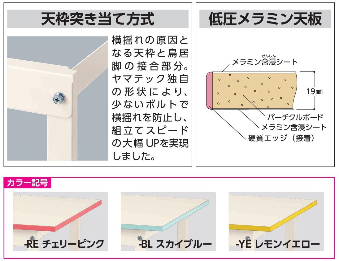 | ●天板エッジ部を3色に色分け。作業の区分けが一目瞭然です。 ●無機質になりがちな作業環境をホワイトカラーの天板と鮮やかなカラーリングで明るいイメージに一新します。 ●耐荷重150kg ![]() ■品番の見方 ![]() ![]() ■仕様 ![]() ![]()
