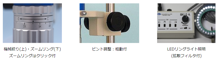 コンバージョンレンズ x0.5取付時:(x42.5~255 モニタ倍率)作動距離110mm コンバージョンレンズ x2.0取付時:(x170~1020 モニタ倍率)作動距離26mm ※コンバージョンレンズは別売りです。 |