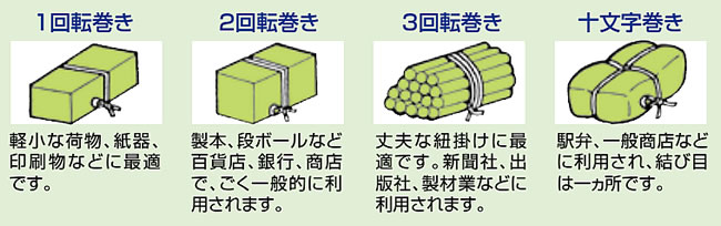 | ●製本紙工業 ●リネンサプライ業 ![]() ●PEポリエチレン紐・PPポリプロピレン紐・綿結束紐など、目的に応じて選択の幅があります。 ●紐を掛けて、結んで、紐を切るまでの所要時間は、わずか1.7秒の秒速タイムです。 ●操作は誰でも簡単に取り扱えます。人手で作業する15人分の仕事をスムーズにこなします。 ■4種類の紐の掛け方 下図のように結束機には、4つの基本的な結束法があります。 ご希望によって、いずれの方法にも適するよう製作いたします。 ![]() ■結束紐状態 正しい結び 図は、自動紐掛機 による正規な結び目で すが、よく締まった固い結び目には2つの同じ大きさの長い結び輪があり、長短2本の紐尻がついています。 ![]() ■仕様 (mm)