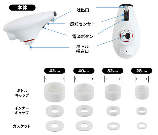 | ディスペンサーポンプの汚れが気になる方へ。 オートディスペンサーボトルキャップをお手持ちのボトルに取り付けるだけでタッチレスの自動ディスペンサーに変わります。 今までのプッシュ式「アルコールディスペンサー」は、不特定多数の人が触れるポンプ上部に触れなければいけないため、接触感染のリスクがありました。 今までのプッシュ式「ソープディスペンサー」は、汚れた手でポンプ上部に触れなければいけないため、手を洗った後、ポンプ上部も洗わなければいけませんでした。 何度もプッシュしなければ適量が出ないため、面倒さに不満を覚える方もいらっしゃいました。 あなたをプッシュの手間から自由にします。 ![]() ![]() ■ディスペンサーのポンプをタッチレスに オートディスペンサーボトルキャップを取り付けたいボトルに「ボトルキャップ」を取り付けます。 「挿込口」に「ボトルキャップ」を斜めに合わせ、起こすようなイメージで取り付けるとスムーズです。 ![]() ■さまざまな口径サイズのボトルに対応 28mm、32mm、40mm、42mmの口径サイズに対応したボトルキャップ付き。 ペットボトルや詰め替え用ボトル、大容量ボトルにも取り付けできます。 チューブ、ストローの長さもカスタマイズ可能です。 ![]() ■目詰まりしにくいチューブ、ストロー 今回ご準備している3種類のうち、液体タイプにはストローとチューブ、泡タイプにはチューブ、霧タイプにはチューブが付属しています。 粘度の高いシャンプーやリンス、コンディショナーが詰まることのないよう、液体タイプにはチューブに加えてより太いストローが付属します。 ![]() ![]() ■充電の手間のない、アルカリ乾電池式 アルカリ乾電池 単4×2本 電池の持ちの目安回数:約10,000回 水場に置くことが多いディスペンサー、充電するたびにコンセントの近くまで本体を運ぶのは手間、また「充電が切れていてすぐに使えない」そんな事のない乾電池を採用。単4刈る仮乾電池2本で10,000回以上(1日5プッシュするなら、約1年間)電池の交換は必要ありません。 ※内蓋はツメ部分を「カチッ」と音がするまでスライドさせてロックして下さい。 ![]() ■節約できる 割安な詰替え用ボトル・業務用ボトルにそのまま使える経費削減に繋がります。 中身の補充回数が減らせます。 大容量のボトルに使用すれば、中身の補充をする回数が少なくなり、手間が省けます。 ![]() ■防水だから気にせずお手入れしやすい キッチンや洗面所でも安心の防滴性能。子供も使うから防水は嬉しい。 IPX6:キッチンや洗面所に置いて水がかかっても安心 ※外蓋・内蓋がしっかりと閉じていることをご確認ください。 ※流水での洗浄は3分以上行わないようご注意下さい。 ![]() ■製品仕様 ![]() ![]() ■取り付け方のコツ ![]() ■タイプ