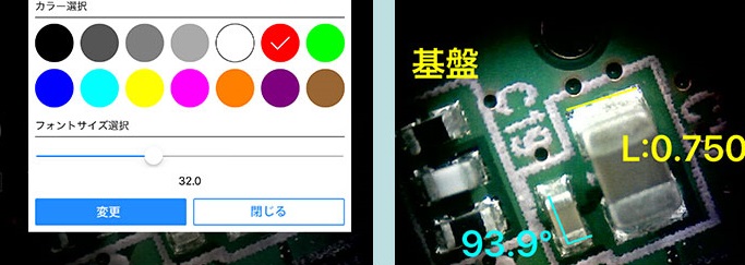 ■専用アプリ・ソフトウェアの機能 わかりやすいアイコン表示や、操作しやすい画面表示で誰でも簡単に使えるほか、専門的な計測や補正機能なども使用できるため幅広い作業で活用できます。 ①保存画像とリアル画像の2画面比較ができる 検品作業の正確さを向上させ、また診療時や美容などのカウンセリング時に以前の状態と比較することにより施術の効果を感じていただきやすくなります。 ![]() ②観察時に参考となるスケール表示機能 中心を軸に表示できるクロススケールや、撮影画像全体に縦横比一定のマスを表示させるグリッド線機能で中心点や、大きさの目印となり、対象物のチェックを効率的にすることができます。 ![]() ③補正・計測機能で現場作業がスムーズに進められます 補正の値を最大5個まで登録することができ計測時には保存している補正結果を呼び出すだけでよく、面倒な補正の作業を毎回する必要はありません。 【複数箇所の計測ができ保存後の画像も計測可能】 1つの画像に対して様々な箇所の計測をしたい、長さ以外にも角度も計測したいなど、そういう時に便利な機能が搭載しています。連続して同じ画像で計測ができるので作業効率がよく、データを活用する際にも1枚の画像で共有・説明ができます。またリアルアイムで観察中の映像上で計測ができるほか、保存した後の画像でも計測ができます。 ![]() 【計測値のみを画面上に表示し続けることができ同じ製品の検品をする際に計測する手間が省けます】 始めに基準として計測した正確な値を画面上に表示し続けることができ、連続して同じ製品を検品する際に対象物を基準点に合わせて置くだけでサイズの確認ができるので、検査のスピードアップに繋がります。 ![]() ④画像のカラー・文字サイズ表記を明確にします 計測値を表示する際に文字のカラーとサイズを選ぶことができるので後から確認したときにせっかく計測した値が見えにくいということが起こりません。 ![]() |