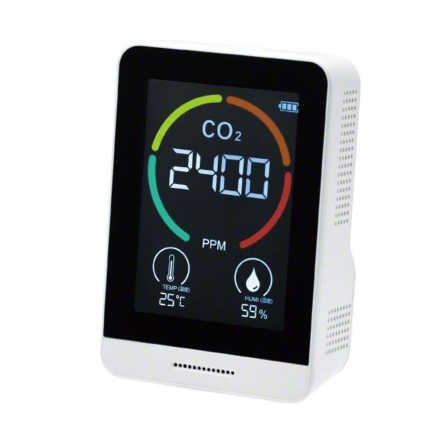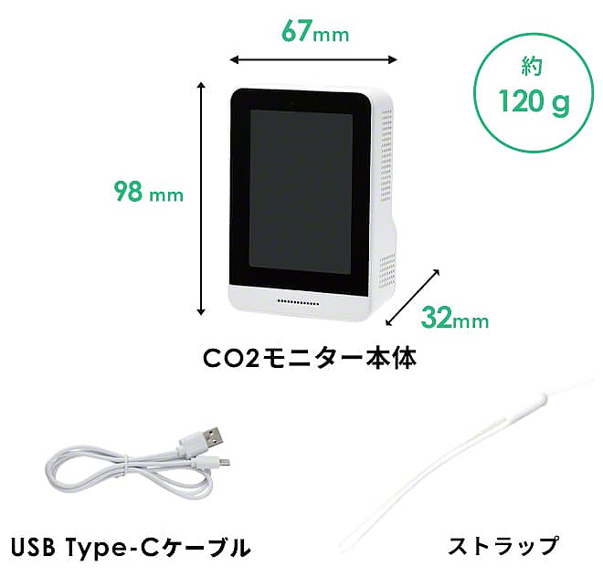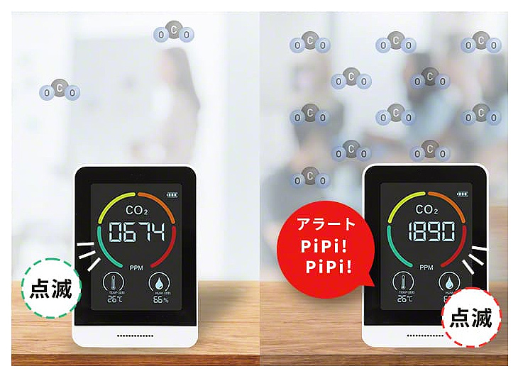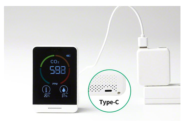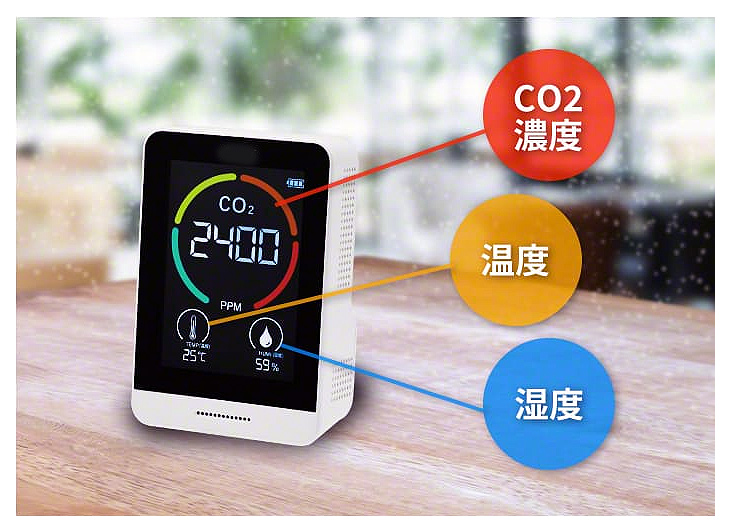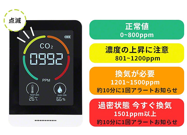 | 厚生労働省推奨のNDIR方式・補正機能付きCO2モニター CO2モニターM926RA-CO2TH13Tは、室内の二酸化炭素濃度・温度・湿度の3つをモニタに表示。換気のタイミングを見える化します。 ![]() ■特長 ●CO2濃度の測定で換気のタイミングを見える化 CO2モニターが換気のタイミングをリアルタイムでお知らせ。感染対策と快適な環境を両立させるサポートを行います。 ![]() ●換気のタイミングを音と色でお知らせ 室内の二酸化炭素濃度、ウイルスの活性化に関係する湿度と温度の3つを表示します。 一目でわかりやすい4カラー点滅の表示方法を採用し、濃度が高い状態ではアラートでお知らせします。 ![]() ●二酸化炭素濃度は4段階 フルカラーで二酸化炭素濃度レベルを点滅表示し現在の状況を直感的に読むことができます。 ※厚生労働省より二酸化炭素濃度1,000ppm以下を基準とした換気状態が提示されています。 ※アラートのオフはできません。 ![]() ●コンパクトで置き場所に困りません スマホよりも小さいサイズで置き場所に困りません。 ストラップ付きで引っ掛けることも可能。 ●電池がいらない充電式 充電はUSBケーブル(Type-C)で行います。(ACアダプタ別売) ![]() ●正確性の高い測定を実現する自動・手動校正機能 測定数値に異常を感じたときは手動で校正できるマニュアル校正機能を搭載。 また継続して充電した状態で使用する場合は自動で校正を行うため、より正確性の高い測定が可能です。 ■用途 CO2モニターの設置により施設利用者や顧客、従業員の感染リスクを抑え、快適な環境を提供することができます。 ・教育・保育施設 ・医療.介護施設 ・オフィス ・店舗・飲食店 さらに、CO2モニターを使用した換気状況を利用者へ案内することで施設の信頼度向上に繋がります。 ■厚生労働省が推奨する換気方法ではクラスター感染を発生させないために 換気設備の適切な運転・点検を実施する。 定期的に外気を取り入れる換気を実施する。※1 と提示されています。 一方で換気を行うと、室内の温湿管理が難しくなり快適性への懸念が高まります。 その対策として厚生労働省は 二酸化炭素濃度測定器を使用し、室内の二酸化炭素濃度が1000ppmを超えていないかを確認することも有効※2 と発表しています。 また、ウイルスの活性化に湿度と温度が関係することをご存知でしょうか? 厚生労働省が発表した感染リスクを抑える基準では温度17℃以上、湿度40%以上の維持を推奨しています。 ※1出典:厚生労働省HP 商業施設等における「換気の悪い密閉空間」を改善するための換気について」より抜粋 ※2 出典:厚生労働省HP 冬場における「換気の悪い密開空間」を改善するための換気の方法より抜粋 ■寸法図 ![]() ■仕様