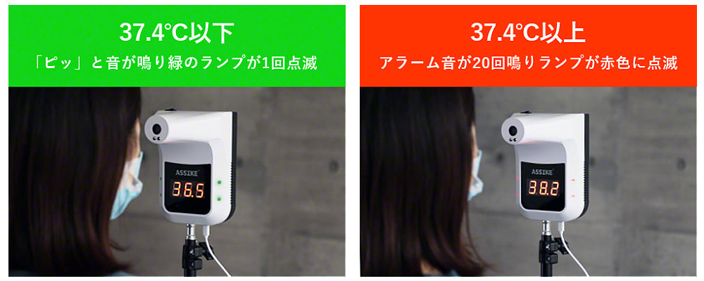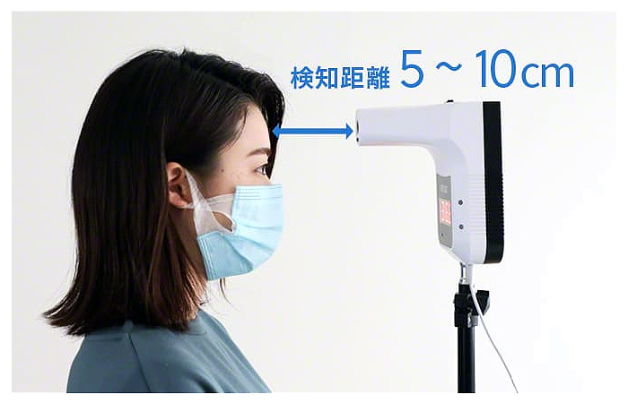 | およそ0.5秒の高速自動測定で素早く体表面温度を測定でき、行列を作らず安全な入館スクリーニングを運用することができます。 測定に特化したシンプルな機能、ディスプレイが数字表示仕様でさらなる低価格を実現。 ※本製品は室内専用です。日光(日光の反射光)が当たる場所ではセンサーの感度が著しく低下するため、ご使用できません。日差しが当たらない奥まった場所に設置してご使用ください。 ![]() ■特長 ●温度計測による入館スクリーニングを無人で運用できます ハンディ型の温度計で計測する際、おでこへ3~5cmに近づける必要がありスタッフの感染リスクが発生します。この非接触温度計は対象者が温度計本体に額を近づけ計測を行うため無人での運用が実現。感染リスクを抑えることができます。 ●測定結果はデジタル表示 体表面温度をおよそ0.5秒の速さでデジタル表示。大勢の方の計測でも行列を作らずに素早く計測することができます。 ●測定温度が37.4℃以上の場合はアラーム音とランプ点滅でお知らせ アラーム音で駆けつけることができるため専任スタッフが駐在する必要はありません ※同じ37.4℃でも37.3℃寄りか37.5℃寄りかで反応が違う場合があります ![]() ●入館時スクリーニング対応例 入館時測定の対応例です。実際に使用される際は状況に合わせてご対応ください。 ![]() ※警報しきい値は37.4℃に設定されており変更はできません。 ※非接触温度計はウイルス感染を判断するものではありません ※体の表面温度を表示するため接触式体温計で測定した体温とは誤差が生じます ※精密な体温計測には接触式体温計をご利用ください ※同じ37.4℃でも37.3℃寄りか37.5℃寄りかで反応が違う場合があります ●測定誤差は±0.2℃を実現 他社製サーモグラフィーカメラの多くが測定精度±0.5℃の誤差に対し、この非接触温度計は誤差±0.2℃での測定を可能にしました。 ※体表面温度を測定するため外気温の影響を受ける場合があります。 ●電源を入れるだけすぐに使用を開始できます PCを使用せず本体の電源を入れるだけですぐに測定を開始。複雑な設定は一切必要なし。測定のみのシンプルな機能で誰でも簡単に始められます。PC接続型と違い、電源を取ることができる場所であれば素早く移動可能。設置場所に悩むことがありません。また、PCやモニタ、それらを置く台など設備を揃える費用や手間を削減することができます。 ●額を本体のセンサーに5~10cm近づけて測定を行います ![]() ●10℃以上で設置可能 この非接触温度計の使用環境温度は10℃以上。(推奨15℃~35℃) 寒い時期、玄関やエントランスなどに設置しての測定も10℃以上を確保できれば設置可能です。 ●付属の三脚または壁掛け対応で場所を選びません 最長190cmの三脚付属。別途購入する手間がなくすぐに使用を開始できます。 また、この非接触温度計は壁掛けにも対応。付属のネジまたは粘着テープで壁に固定することができ設置場所を選びません。 ![]() ■用途 ●スタッフの接触感染予防に 額を近づけるだけで接触せずに測定可能 ハンディ型温度計とは違い、人の手を介さずに測定が可能。本体に対象者の額を近づけるだけで接触せずに体表面温度を測定することができます。 ●オフィスや店舗、教育・医療・宿泊・商業・公共施設などの設置に 施設を訪れる方のために、検温への取り組みが感染拡大防止に繋がります 非接触温度計を設置し入館時の検温管理を徹底することで、訪れる方の不安を軽減。施設を利用される方の安心感や施設への信頼度を高めます。 ■サイズ ![]() ■付属品 ![]() ■仕様
