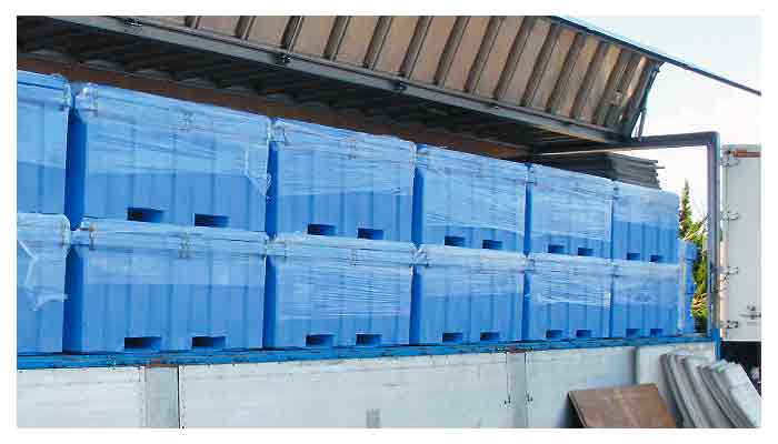 搬送トラックの荷台にフタ有・フタ無のどちらも段積みすることができるので効率のよい搬送作業が可能です。