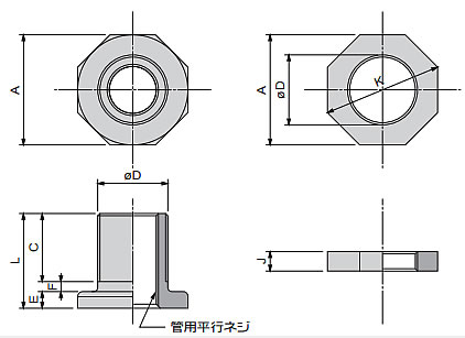 ノズルおよび 2 枚のナット、2 枚のパッキンから構成されています。