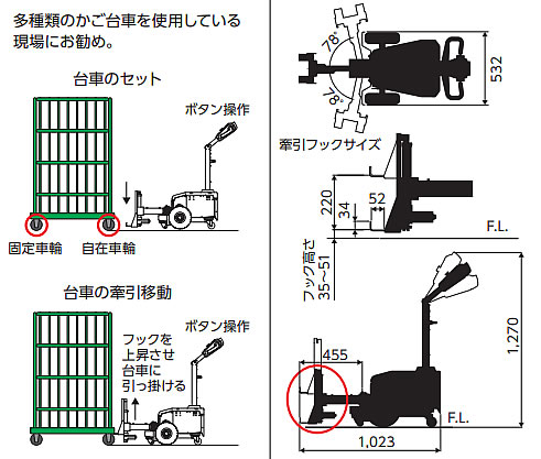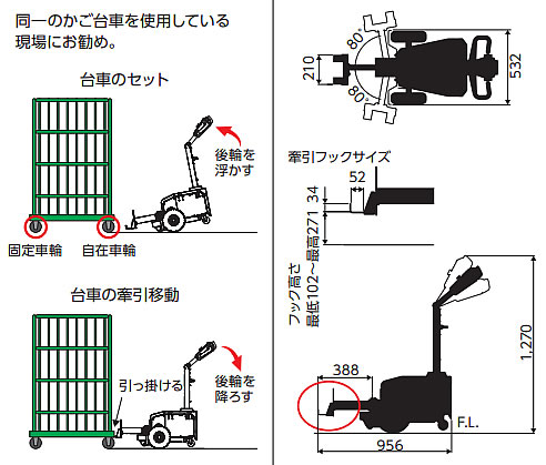 | 台車にワンタッチで引っ掛け、力を使わず自由自在に移動させる事ができます。 ●充電時間/約8時間 ●走行速度/3.2km/h(全負荷時) ●フォークリフト免許不要 ●連続走行目安時間(全負荷)/2.5時間(注2) (注2)テストは新品のバッテリーを満充電した状態で行っています。 バッテリーの劣化や床の状態、使用環境によって異なります。 ![]() ■速度切り替えスイッチ 走行速度を2段階切り替える事ができます。 ![]() ■バッテリー残量計 LEDを使ってバッテリーの残量を確認していただけます。 ![]() ■ハンドルは操作がしやすい左右対称です。 ![]() ■牽引フック ![]() ■MC30ELN-1000KG(標準タイプ) ![]() ■MC30ELA-1000KG(オート) ![]() ■仕様