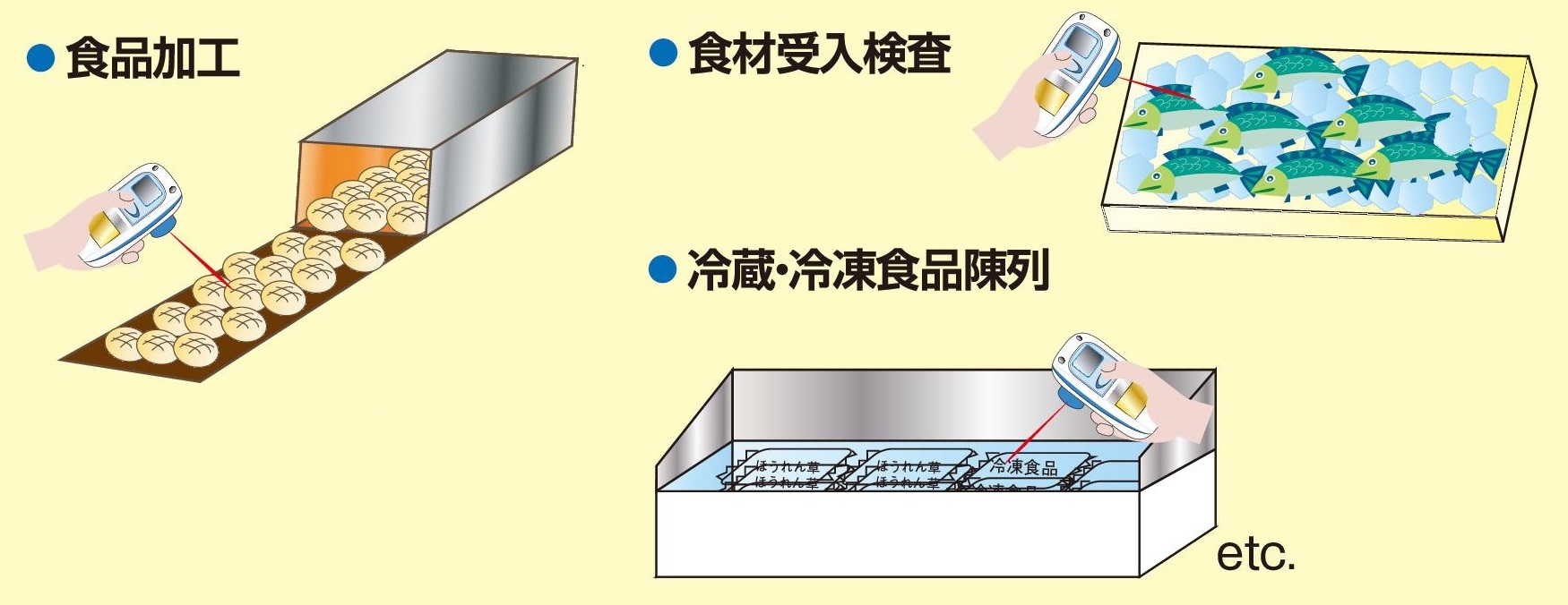 | 測温範囲-40~300℃の防水形ハンディ放射温度計です。 ワンボタン操作で、測定位置確認用にレーザポインタが付いているので誰でもすぐに使えます。 ![]() ![]() ■特長 ●Bluetooth通信で測定したデータを転送 ●汚れても水洗いできる防水タイプ(IP67の防塵防水構造)。 ●対象にふれずに1秒で計測できる温度計です。測定ポイントをレーザビームで確認しながら測定できます。 <測定距離と測定径の関係> ![]() ●ケースは衛生的な抗菌仕様ABS樹脂使用。 ●自然食品にはない青色パッキンの仕様で破片が食品に混入しても発見が容易。 ●ショックに強く、落としても壊れない。(高さ1m、ビニル製タイルの床にて) ●オートパワーオフ機能により電源の消し忘れをカバー。 ●HACCPやISO9000、ISO14000に適したトレーサビリティ証明書(別売)の発行が可能。 <レーザビームをご使用にあたってのご注意> ・レーザビームをのぞきこんだり、人の顔に向けて照射しないでください。 ・測定面が鏡面に近いもの(光沢のある金属など)を計測する場合には、反射による影響にもご注意ください。 ■用途 ●食品の温度管理に…(輸送・受入、加工、陳列) ![]() ■仕様