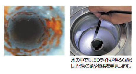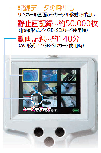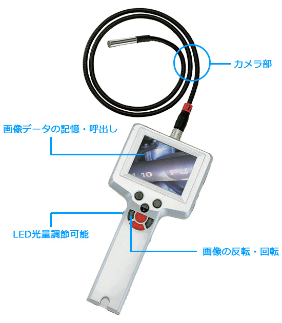 | ■特長 ●30万画素の鮮明画像“選べる”豊富なラインアップ ●内視鏡本体とカメラプローブの組合せで構成されています。 ■各部機能 ![]() ●画像データの記録・呼出し ![]() ●LED光量調整可能 電源のON/OFFおよびLEDライトの光量調整を行います。 ![]() ●カメラ部 インターロックカメラ部/フレキシブルカメラ部は、防水構造(IP57)のため水中でも使用できます。 ※本体部は防水構造ではありません。 ![]() ●画像の反転・回転 カメラプローブが曲がりくねって入って行くと、モニター上に映し出される画像が回転して判り辛くなることがあります。 このような時、画像を簡単に反転・回転することができます。 ![]() ■タイプ