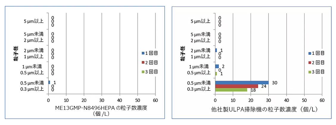 | 高性能・安全・頑丈で、排気がきれい・埃が舞い上がりにくい設計 HEPAまたはULPA仕様で溶接ヒュームやアスベスト対策にも対応。 ![]() ■特長 メーカー独自の4段フィルトレーション・システムによりミクロの粒子を高次元で捕集し、さらにホースや接合部からの漏れを防ぐ密閉構造を採用したクリーナーです。 アスベスト、食品・医薬品産業、医療現場、化学、精密機器、エレクトロニクス産業、オフィス、ホテルなどあらゆる現場で活躍します。 ![]() ●高い作業効率 小型ながらも高い吸引力を有するモーターを搭載しております。モーター自体を保護する保護フィルターが装備されており、粉塵の付着によるモーターの故障頻度を大幅に抑制できます。 また、低重心かつ軽量なアルミ製ボディと無発塵タイプのキャスターにより、広い作業現場から入り組んだクリーンルームの室内まで、幅広い場面に対応します。 ![]() ●高い安全性 モーター保護フィルターとHEPAあるいはULPAフィルターを含む独自の4段フィルトレーション機構を搭載し、溶接ヒュームやアスベストのような有害粉塵も徹底ろ過。 また、密閉精度を考慮した高精度設計になっており、隙間からの異物の漏洩を徹底的に防ぐ構造になっています。 ●フィルターだけではない、 性能を決める「設計思想」 市場には、多くのHEPAフィルター仕様の掃除機や、高性能を謳った掃除機が販売されております。しかし、単にHEPAやULPAフィルターを組み込めば有害粉塵を漏れなく回収できると言うわけではありません。 下表はME13GMP-N8496HEPAと他社製ULPA仕様掃除機の、使用後の排気中に含まれる粒子数を、国内の第三者検査機関で調査したものです。他社製品はHEPAよりハイスペックなULPAフィルターを使用しているにもかかわらず、排気中に粒子が漏出しております。これは、本体設計が十分考慮されておらず、ULPAフィルターを組み込んでも様々な隙間から粒子が漏出してしまっているためです。 粒子が有害物質の場合、使用者の健康に悪影響を及ぼす可能性がございます。その点、ME13GMP-N8496HEPAであれば粒子の漏出はほとんどなく、安心してご使用いただけます。 ![]() ■使用例 ![]() ■付属品 ![]() ■仕様