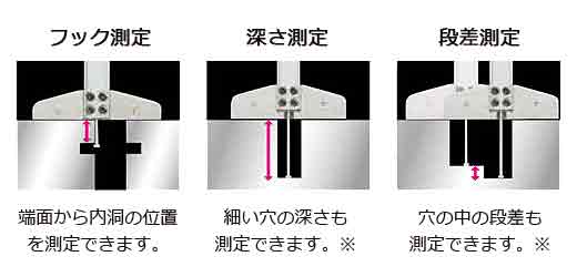 | ■特長 ●フック付デプスバーで3つの測定が可能 ※深さ測定・段差測定は附属アタッチメントを用います。フックの下端面とアタッチメントの端面がフラットな状態になり、ゼロ「0」セットされます。 ![]() ●フック先端φ6、φ8が新登場! ![]() ●データ出力機能付 ●フック幅を広くした製品もございますです。(ME29DP-15B6K、ME29DP-15B8K) ■仕様