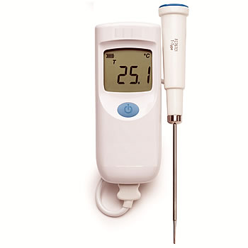| 約4秒で測定できる超速温度計 食品に突き刺し可能な防水型の温度計は衛生的なステンレス製Tタイプサーモカップル(熱電対)センサーを採用。 4秒以内に終点(最終の読み取り値)の90%まで到達する超速タイプ メーカー独自の機能により電源ON時に自動的に内部回路をチェック。 単四電池3個で約3500時間の継続使用ができ、電池残量(%)は電源ON時に画面表示します。 ![]() ■特長 ●食品への突き刺しはもちろん、液体や空気中の温度も測定可能。 ●測定範囲は-50~300℃。 ●メーカー独自の機能により電源ON時に自動的に内部回路をチェック。 ●温度センサー部はヨーロッパのEU規則にあるNo.1935/2004「食品に接触する素材および製品に関する規則」に適合するように設計。 ●電極は簡単に交換可能。 ●単四電池3個で約3500時間の使用が可能 ※トレサビリティ校正も対応可能です。