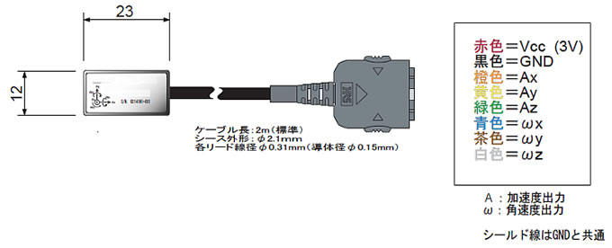 6軸のモーションセンサーです。![]() ●3軸加速度センサと3軸ジャイロセンサをワンパッケージ化(6軸モーションセンサ) ●小型・軽量(W23×D12×H5、約3g) ●高さも低いため狭い場所にも取り付け可能 ![]() ■主な構成 ※ケーブル端末加工については、フリー/指定コネクタを取り付ける事も対応可能 ![]() ![]() ■外観寸法図 ![]() 国家基準とトレーサビリティのとれた校正の対応も可能!(有償) 本製品の仕様は予告なく変更する場合がございます。 本製品は「外国為替及び外国貿易法」に定める正弦貨物に該当するため、輸出する場合には同法に基づく輸出許可が必要になります。 ■仕様