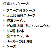 | 現場での使用や研究室での使用のために設計されています。 厳格な国際的な品質基準のもとで製造された、長年間、信頼できる運用使用を保証しています。 測定プローブには、耐摩耗性に優れた超硬チップが付いています。 これは、ほぼ無制限の寿命があることを意味します。 プラスチック製のプローブフットはV溝で設計されているため、水平、円筒形、または曲面での安定した位置決めが可能です。 ![]() ■主に次の分野で使用されまています: ペイントショップ 塗料コーティングと粉体塗装 自動車の塗装評価と自動車ワークショップ 鉄鋼建設、自動車製造、船舶関係 入荷製品の膜厚チェック 生産工程中の膜厚チェック 最終検査と品質保証 研究開発室 ![]() ■利点 革新的でユーザーフレンドリーな技術:オンにして測定するだけ 高い測定精度 カーバイドメタル製測定チップ 平面/粗い面/湾曲した表面の測定に対応 校正不要の測定 要求の厳しい測定アプリケーション向けの校正機能 鉄/鋼および非鉄金属の測定用 FNプローブ 鉄/鋼の測定のための Fプローブ FN プローブによるベース基材の自動認識 暗い場所でも表示できるバックライト表示 コーティング中の亜鉛層の簡単な検出- FN オンライン統計(n, ¯x, s, min, max) 安定した位置決めのための大きなプローブフット 測定値が記録されたときの音響信号 測定単位変更 μm/mils メーカーの証明書付 統合または外部プローブあり 2年間の保証 ![]() ![]() ![]() ■仕様