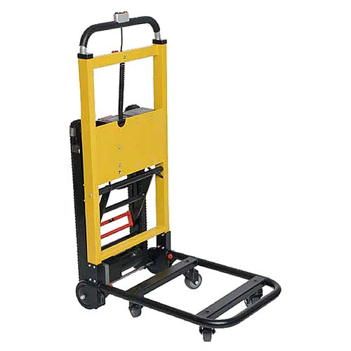 | 重い荷物を階段でも楽に、昇り降り運搬ができる電動台車です。 中型サイズの手押し台車の背面に、階段を昇り降りできる電動の走行ベルトと、運搬を安定させる伸縮するハンドルがついています。 平地走行は手押しでスムーズに、そのまま階段を楽々昇っていける台車です。 ![]() ■特長 ●階段を安全に昇り降りする電動走行ベルトと伸縮ハンドル 台車の背面にある走行ベルトは、キャタピラのような凸凹と滑りにくいゴムで、階段の段差でもを昇り降りすることを可能にします。使用するときは、走行ベルトを倒して角度をつけて、階段に走行ベルト全体が接するように倒しながら進みます。 ![]() キャタピラのような走行ベルトがしっかり階段を昇り降り 最大階段角度30~35度 使用できる階段の最大角度は最大35度で、走行スピードは、昇降どちらも8.6m/分 1分間に約28段進めます。 ![]() ![]() ●伸縮ハンドル 階段を昇り降りする際は、ハンドルの位置がそのままだと、かなり腰を曲げて屈んだ状態で進まなければいけなくなってしまいます。そうならないように、ハンドルは、3段階で伸縮することができるので、屈まず立って階段を昇り、安定した運搬をすることができます。 ![]() ●狭い階段でも昇り降りできるコンパクトなサイズ感 中型サイズの手押し台車よりもすこし小さいくらいのサイズ 狭い階段でも昇り降りできるコンパクトなサイズ感 ![]() 大きさは、中型の手押し台車サイズ(耐荷重約300gの折りたたみ手押し台車)より少し小さいくらいで、小回りがきいてなおかつ階段も昇り降りできるので、マンションなどの細い階段でも運搬することが可能です。 ![]() ●最大積載量160kg コンパクトサイズの台車ですが、最大積載量は160kgとパワフル。冷蔵庫や洗濯機などの大型家電に、タンスや机などの家具、ビール瓶ケースやペットボトルなどの飲料など、重い荷物を載せても階段を昇り降りできます。 ![]() ●手元でボタン1つの簡単操作 ハンドル中央に走行ベルトを操作するコントローラーがあります。コントローラーには、「昇降電源ボタン」「昇るボタン」「降りるボタン」があります。バッテリー横に鍵をさして主電源を入れてから、手元の「昇降電源ボタン」をONにすると、動かせるようになります。「昇るボタン」「降りるボタン」は押しつづけると走行ベルトが動き出します。ボタンを押し続けたときだけ動くから、離せばすぐにその場で安全に停止します。 ![]() ●女性でも簡単に操作 女性でも簡単に操作できて、力を入れなくても楽々運搬できます。 ![]() ●充電バッテリー式でコードレス 台車背面にあるバッテリーは、取り外して充電することができます。充電時間は約3~4時間で、満充電から使用すると約80分※と長時間の動作が可能です。 ※80kgの荷物を載せた場合 ![]() ■寸法図 ![]() ■仕様