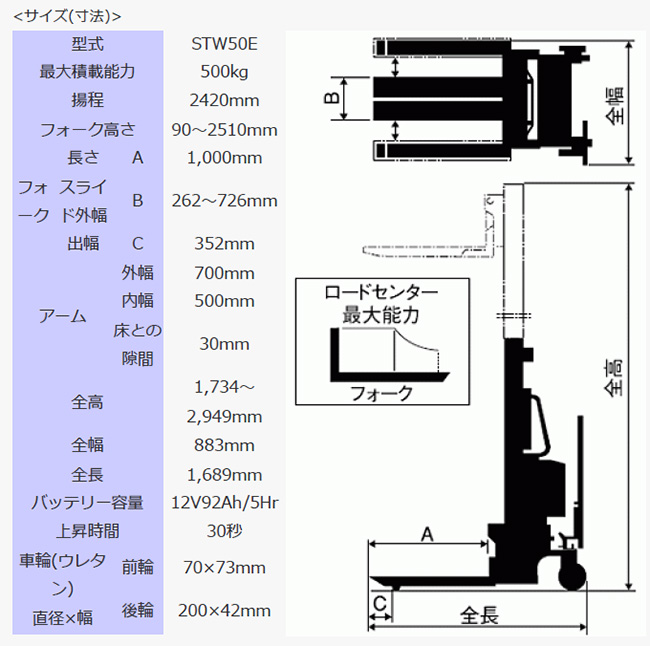| 点検完了済み 新品バッテリー交換済み 新品充電器付属 ●レバー操作で上昇・下降は、ワンタッチです。昇降スピードはレバーを倒す角度に応じた可変式です。 ●各種工場、物流センター、倉庫などの運搬昇降(高ストローク)台車として。 ![]() ■仕様 ●手動走行式 ●昇降方式:バッテリー油圧式(タービン油:ISO-VG32使用) ●電源:単相100V(コード長2.5m) ●充電時間:約7時間 ●前車輪:固定ウレタンキャスター2個 ●後車輪:自在ウレタンキャスター、自在ストッパー付ウレタンキャスター各1個